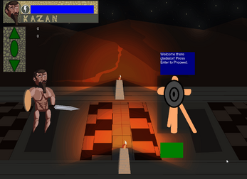 UPDATE: 7/10/2019 - I spent time correcting the animations of the NPC, added an intro to the NPC with dialogue (not skip able). I've created a small database for armors and threw in the Murmillo armors. I've tweaked the battle formulas to reflect something a bit easier for game play sake, however there are still issues with the npc formulas not scaling properly. I've introduced a MARKOV chain to the NPC and he will behave accordingly to the player: Aggressive and Withheld. I've added a critical hit chance for the combat system that uses a custom random function, well ok 4 functions. The game will now end when the player has 0 health. The target no longer gives an error when progressing the tutorial beyond what is written. I've corrected the alignment issues with the y axis for the player and npc sprites.